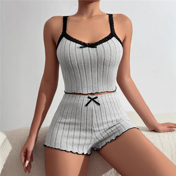 Nuevo traje de rayas sólidas para mujer, Conjunto de pijama Sexy con lazo para mujer, ropa de dormir para mujer, pijama suave con corazón, traje de rayas de punto