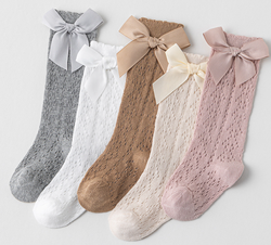 ถุงเท้ายาวถึงเข่าสำหรับเด็กทารกแรกเกิดถุงเท้าถักลายจุดมีโบว์ระบายอากาศได้ทำจากผ้าฝ้าย